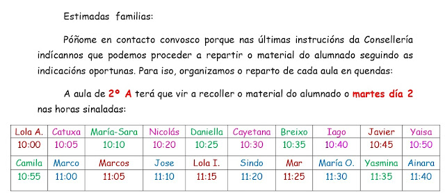 Tedes no correo a seguinte información para recoller o material dos nen@s a próxima semana.